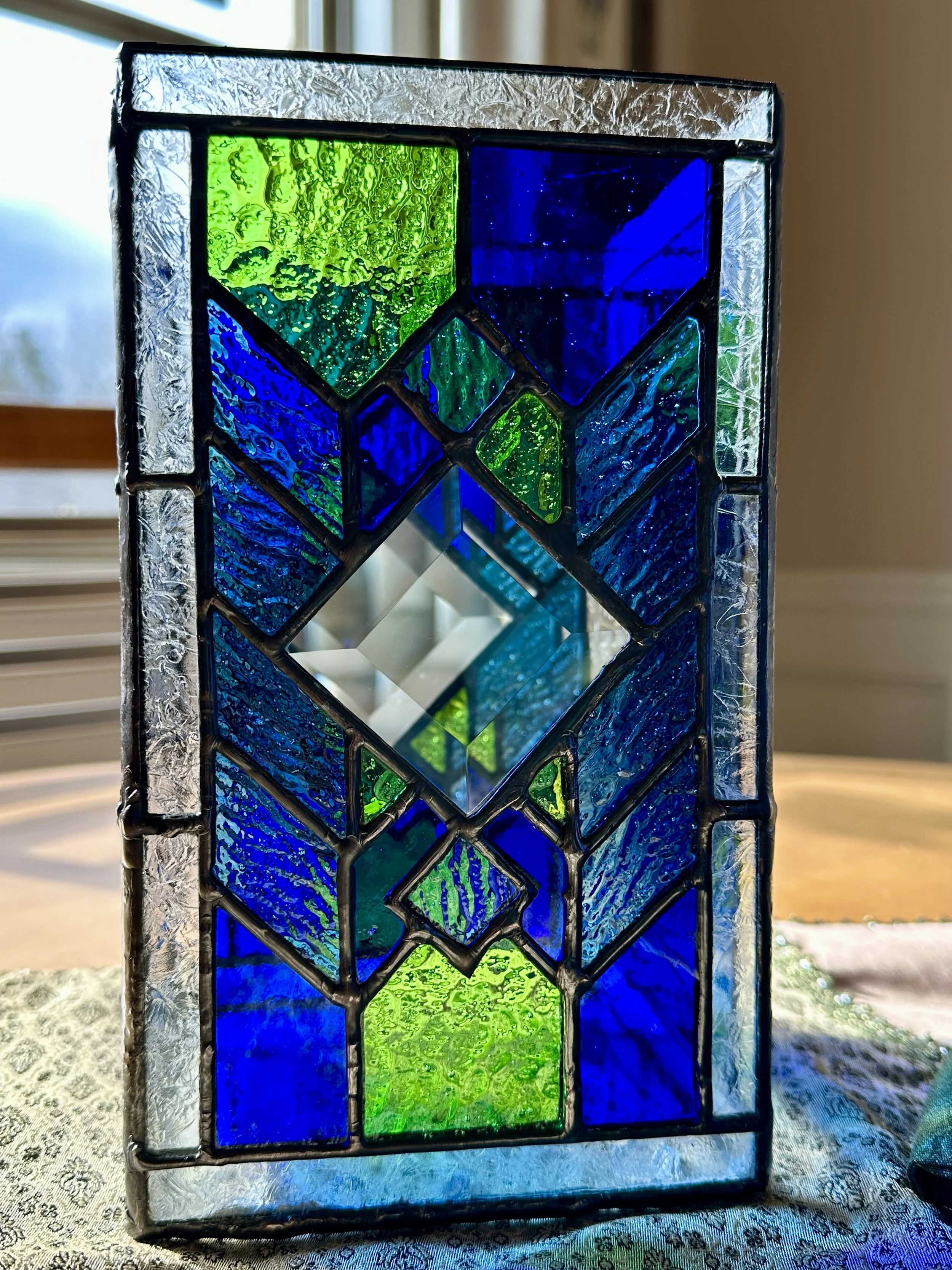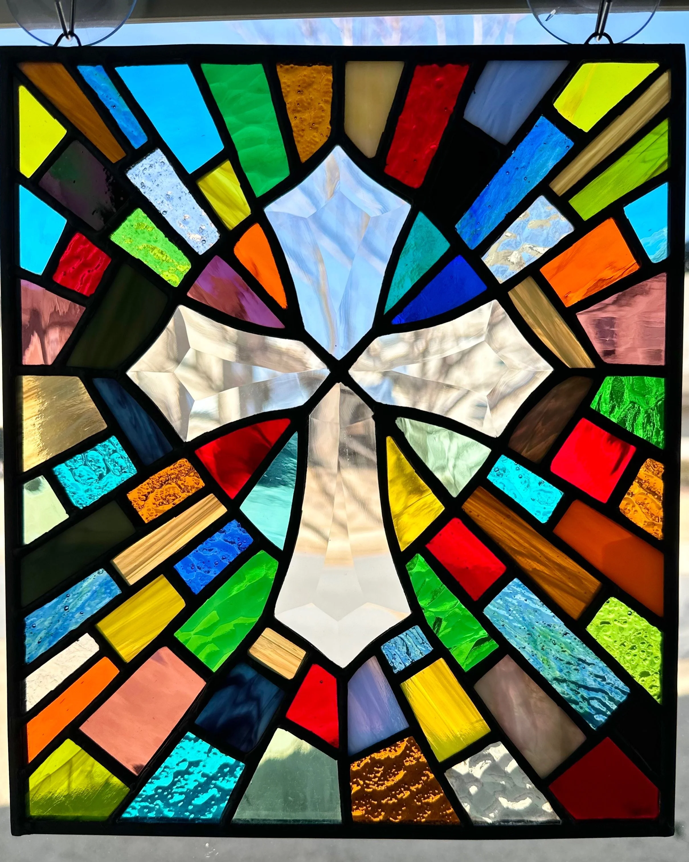 Straight from the artist’s imagination. It all began with an idea to incorporate four small bevels into a mosaic that would blend curves and lines.
